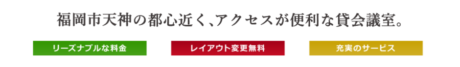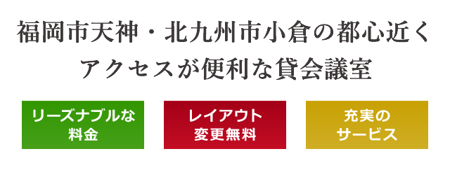 福岡市天神の都心近く、アクセスが便利な貸会議室。 少数のミーティングから大規模な会議など、様々な催しに適した施設を低予算で、 主催者様のご要望にあわせたお手伝いをさせていただきます。